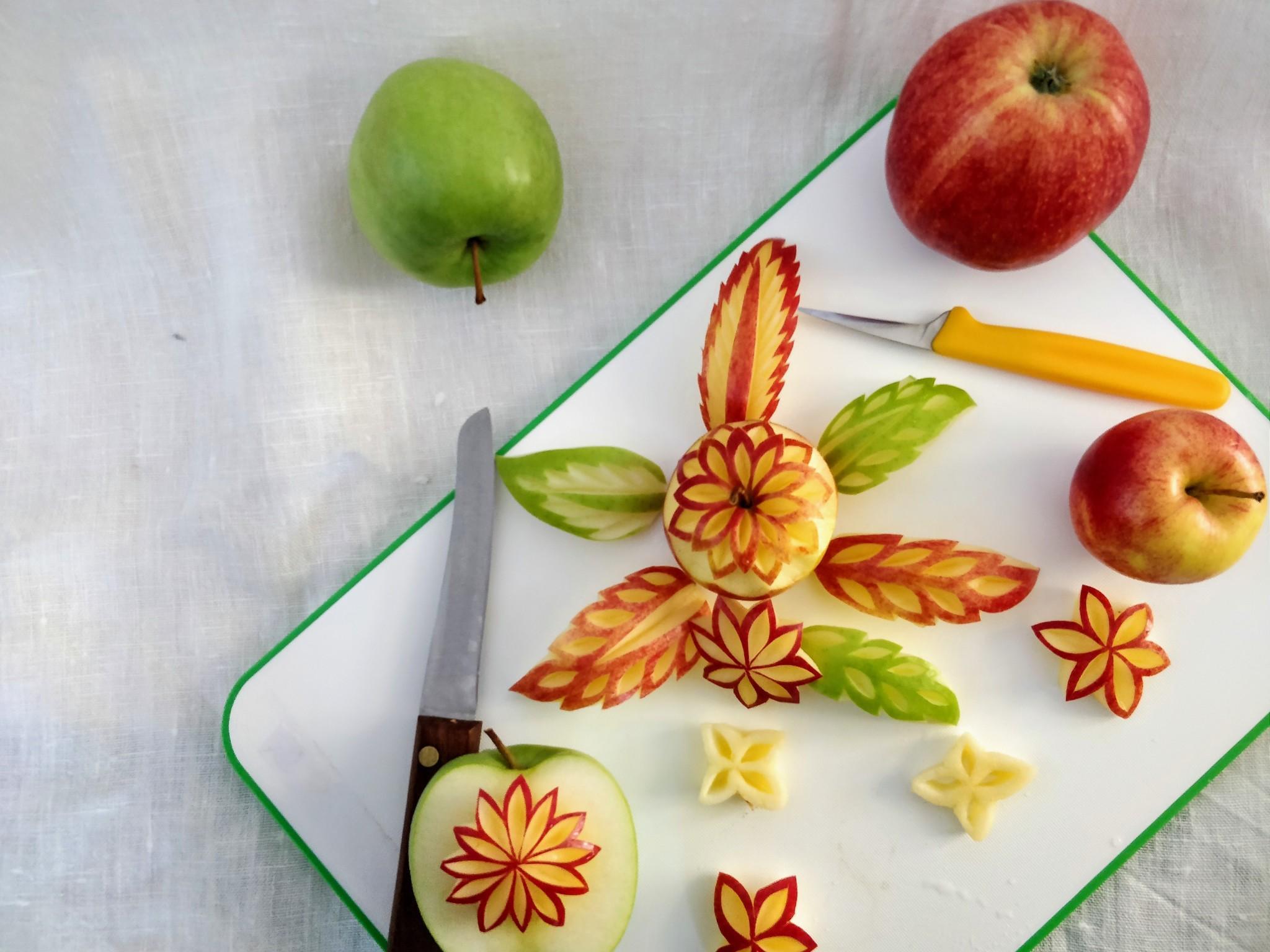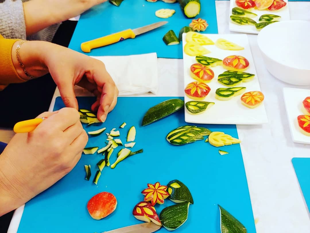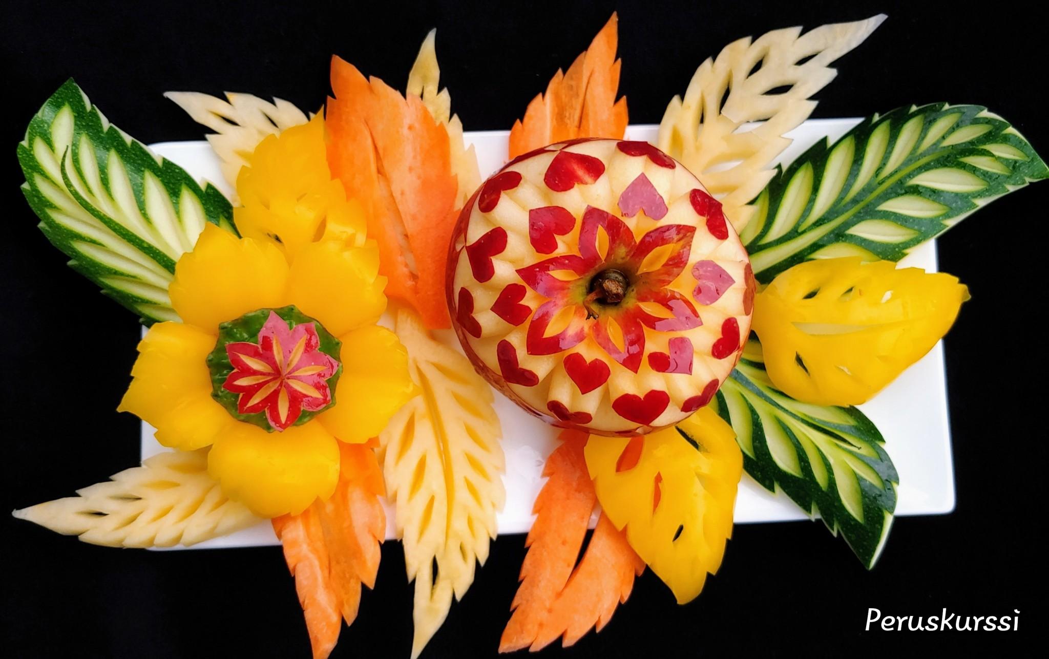 In the Basic Course we learn to use a carving knife. We make some two dimensional carvings such as leaves, and simple three dimensional flowers from cucumber, carrot, apple, and/or rutabaga. Teaching language is Finnish, but it can be supported in English.