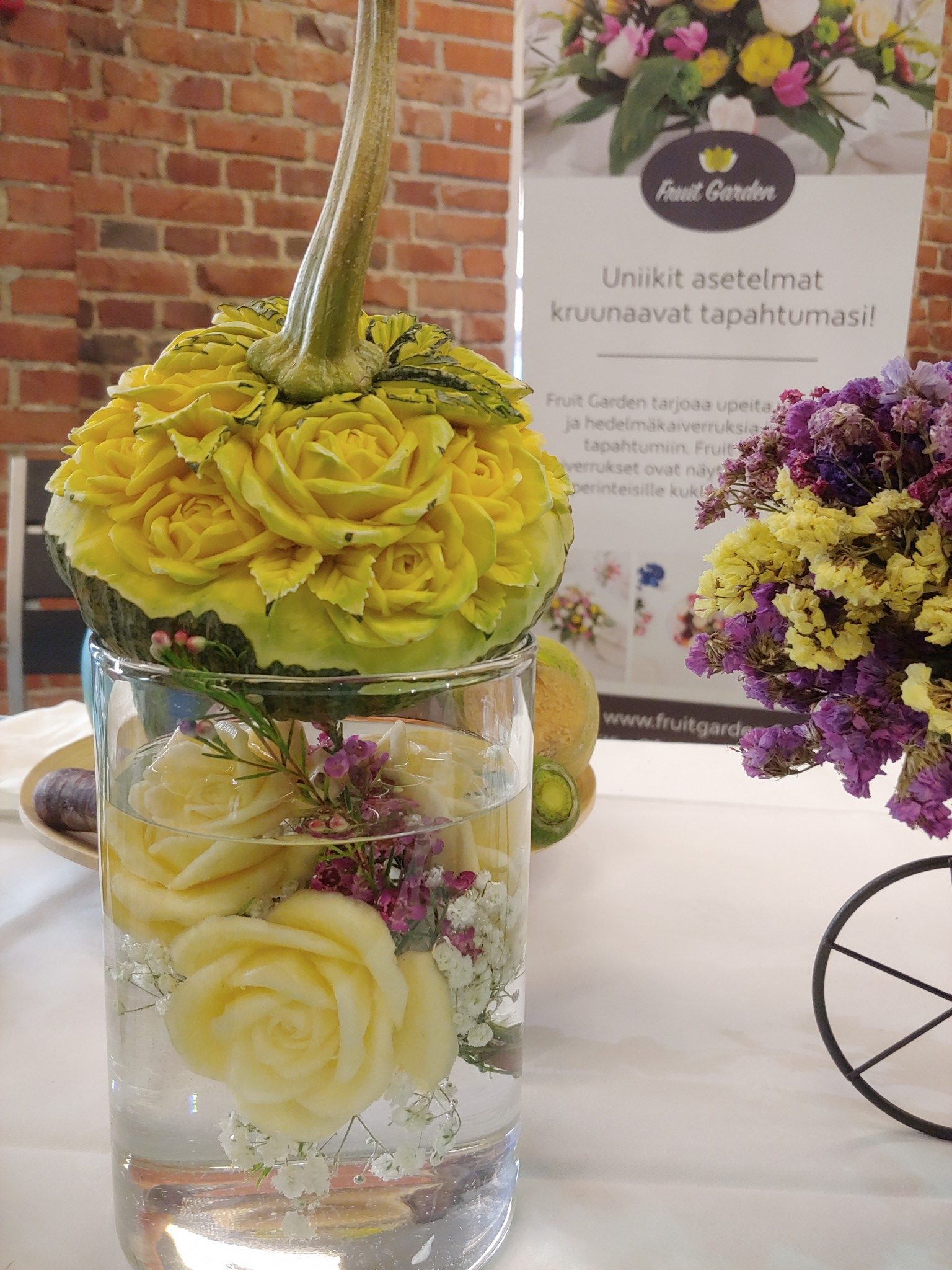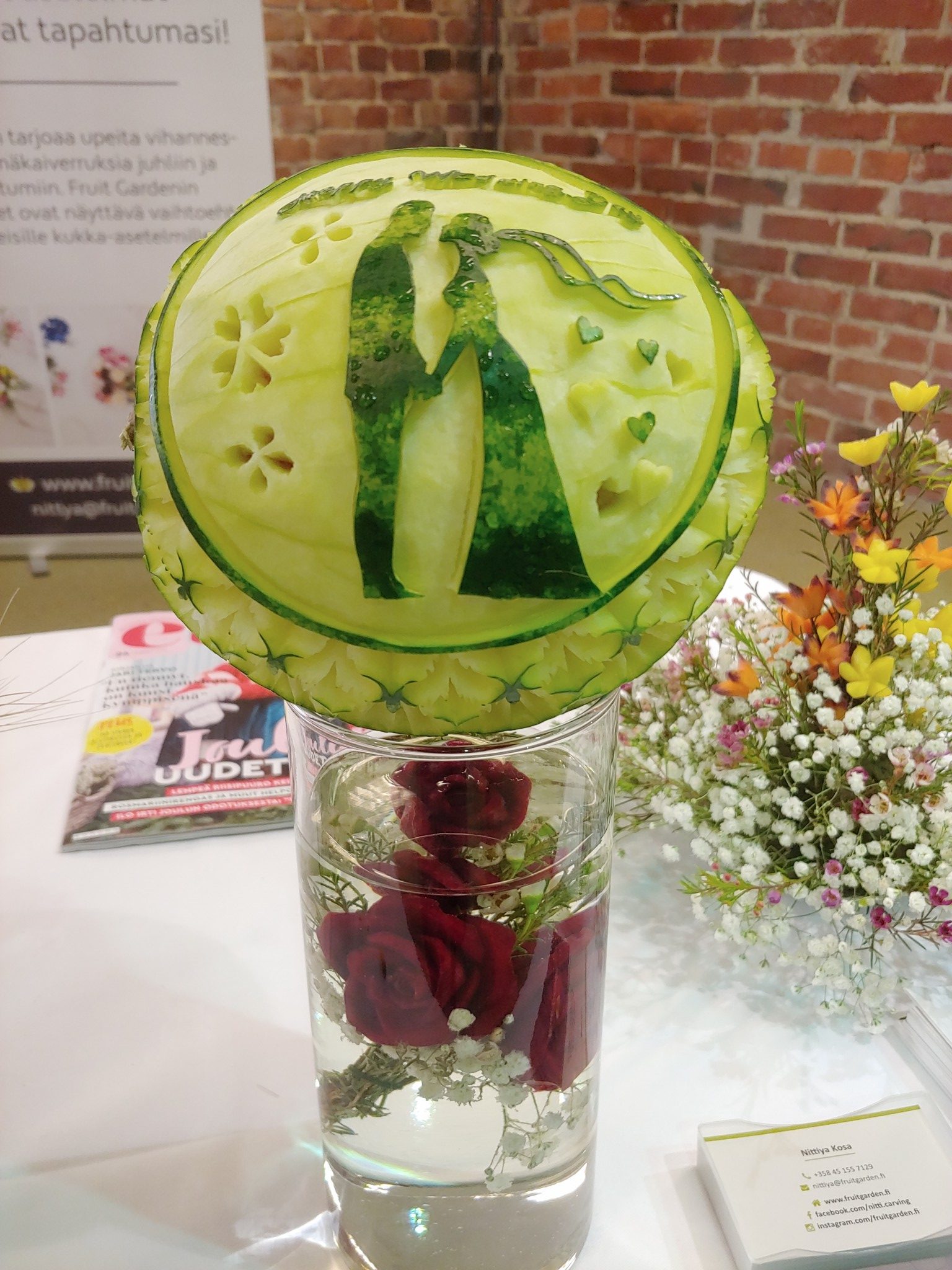 - SH114. Punajuuresta kaiverretut ruusut vedessä ja kaiverrettu meloni. Hinta 130e sisältäen maljakon.