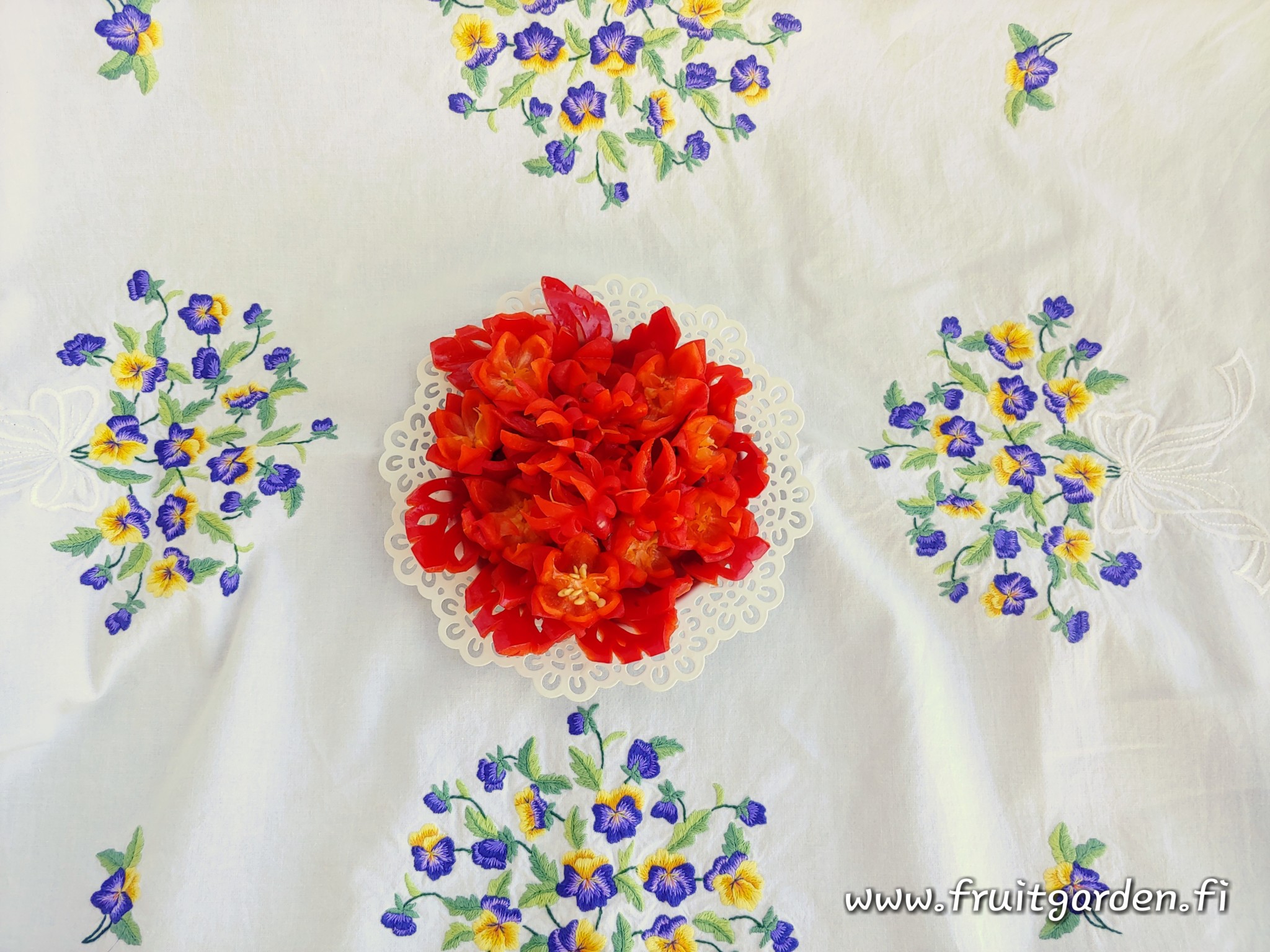 Fruit Gardenin hedelmien ja vihannesten taidekaiverrukset on ensisijaisesti tarkoitettu silmän iloksi. Koska materiaali on kasvatettu ihmisten ravinnoksi, miksipä ei tehdä kaiverruksia myös ruoka-annoksien koristeeksi, sekä silmän että suun nautinnoksi.